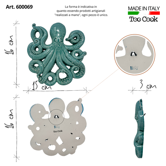 Toocook Glazed Ceramic Octopus for Wall Decoration and Home Furnishings, Handcrafted, Gift Idea Made in Italy